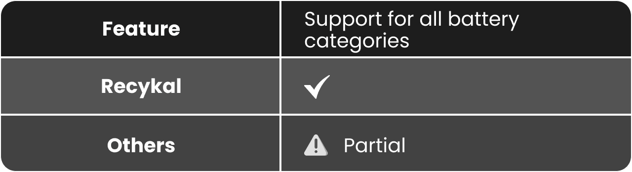 CPCB has defined four battery categories: - Portable Batteries - Electric Vehicle (EV) Batteries - Automotive Batteries - Industrial Batteries Each has separate collection targets and reporting requirements where Recykal can help.