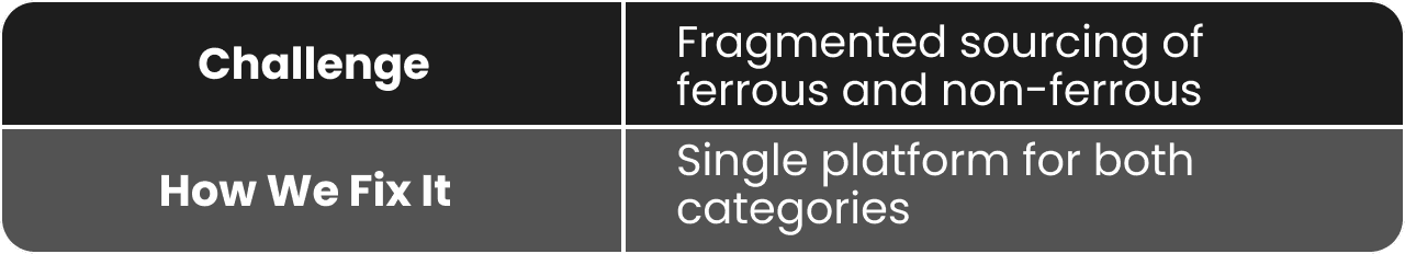 A B2B managed marketplace for SMEs and OEMs to source ferrous and non-ferrous scrap from GST-compliant sellers across India, with delivery tracking, quality proof, and complete documentation.