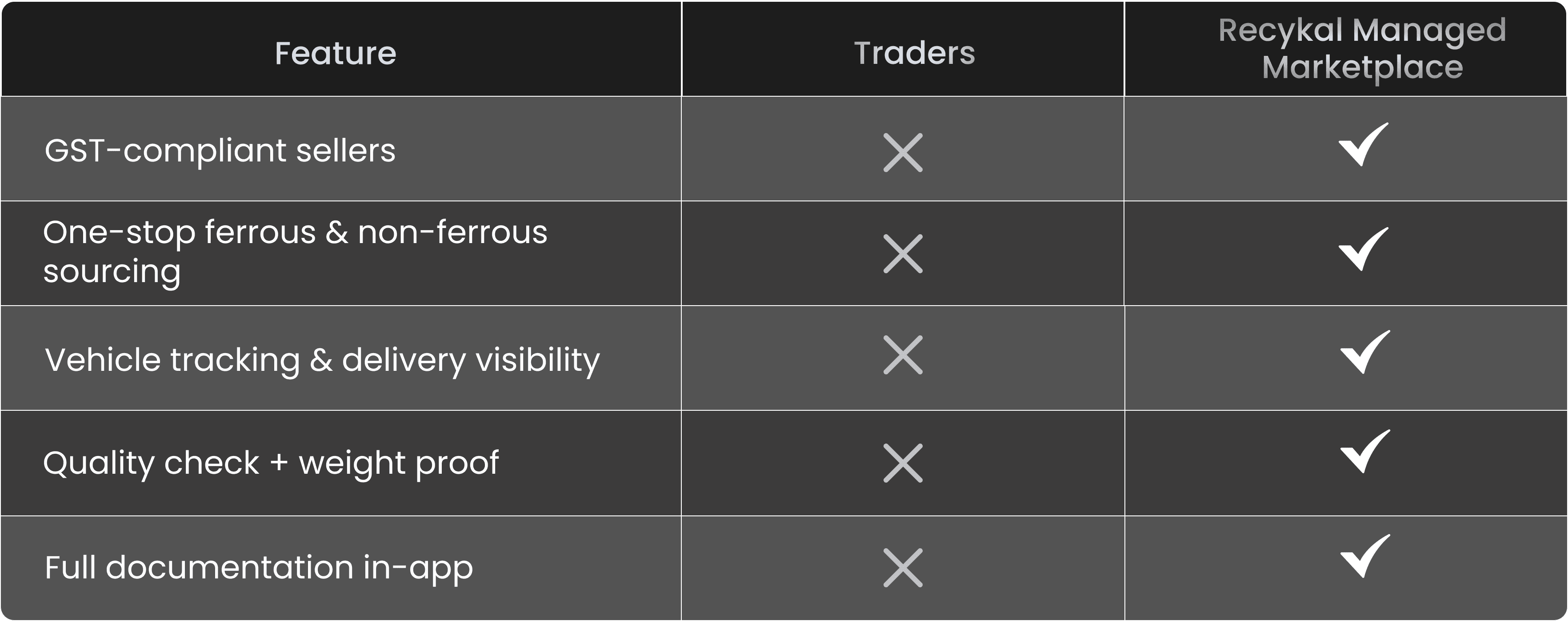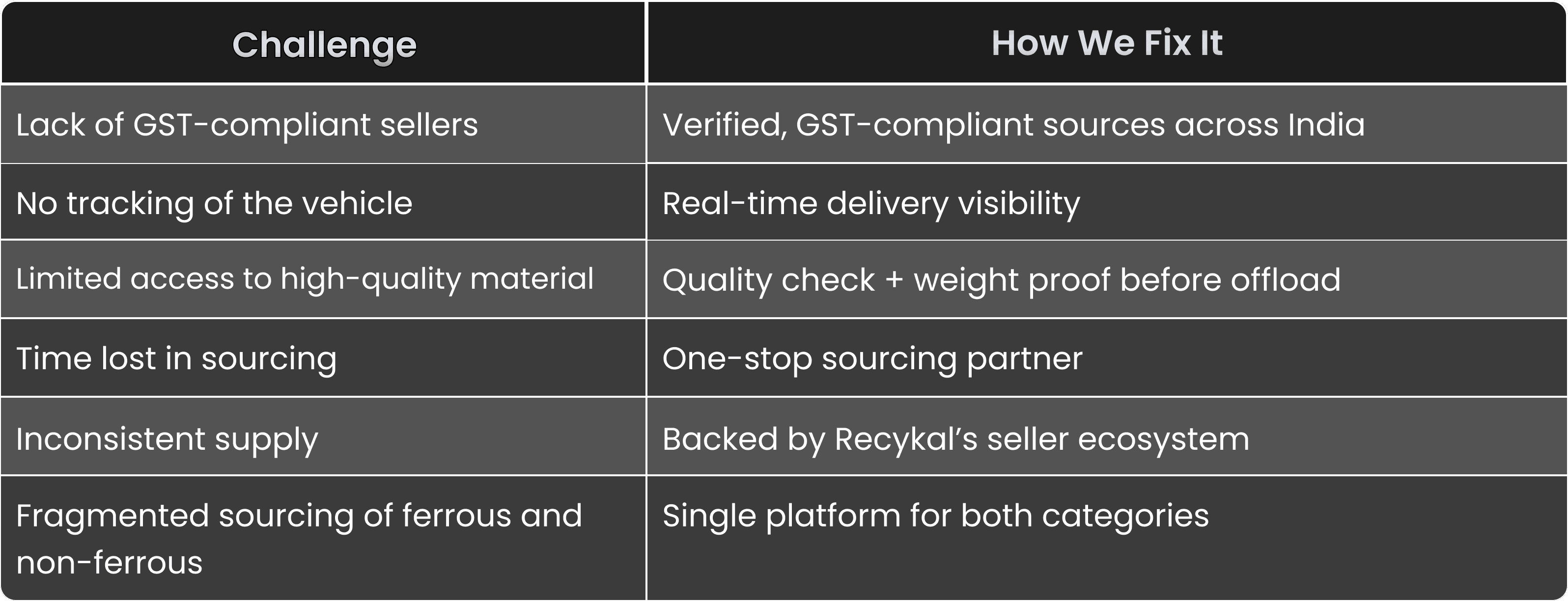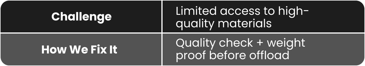 Lack of compliant sellers, no vehicle tracking, inconsistent supply, fragmented sourcing, and no quality proof.