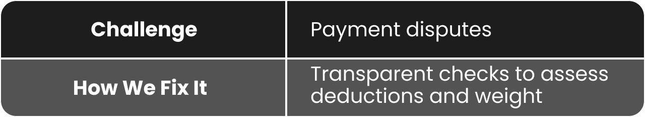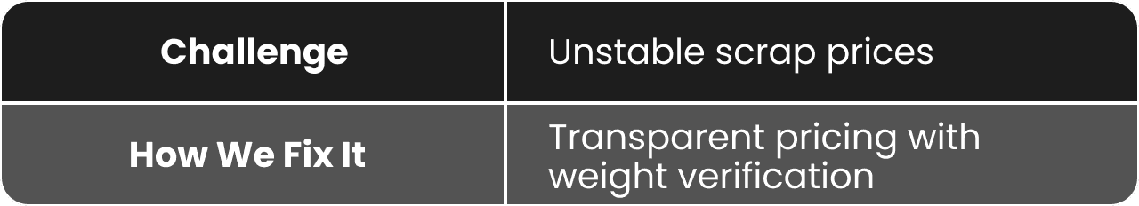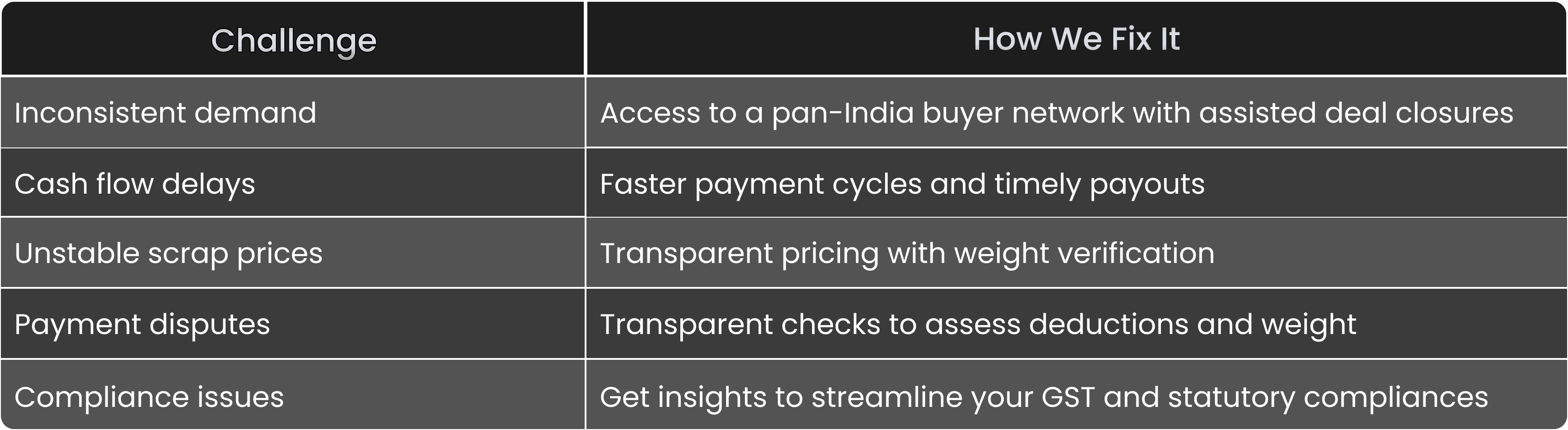 Inconsistent demand, varying scrap prices, delayed/unpredictable payments, and lack of transparent checks to assess deductions, plus logistics hassles.