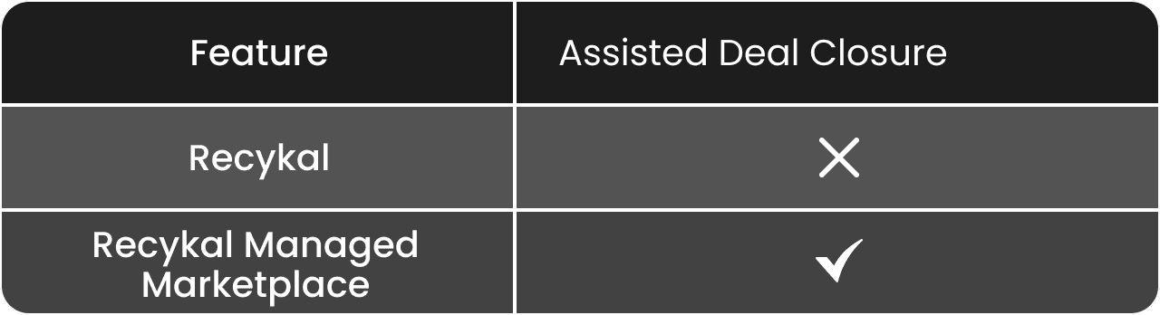 End-to-end support (demand, deal closure, logistics, payment), one platform for ferrous + non-ferrous, and recycled finished products with transparent/tech-led visibility on weight and rate, faster payouts, and GST-invoiced deals.