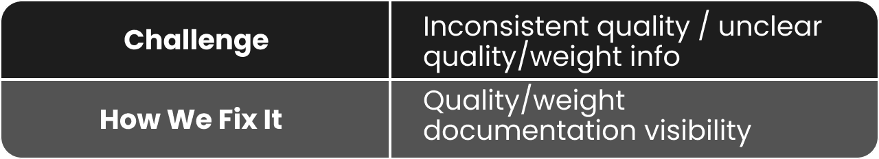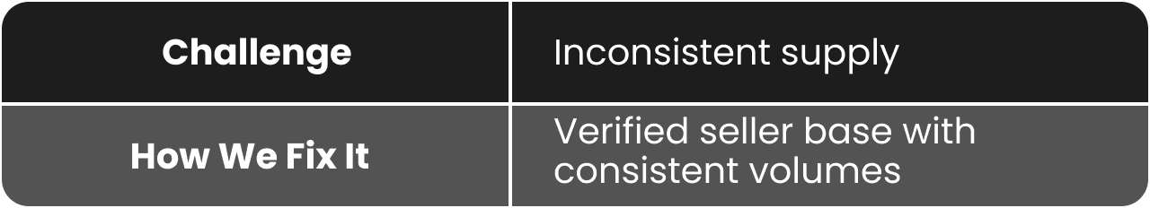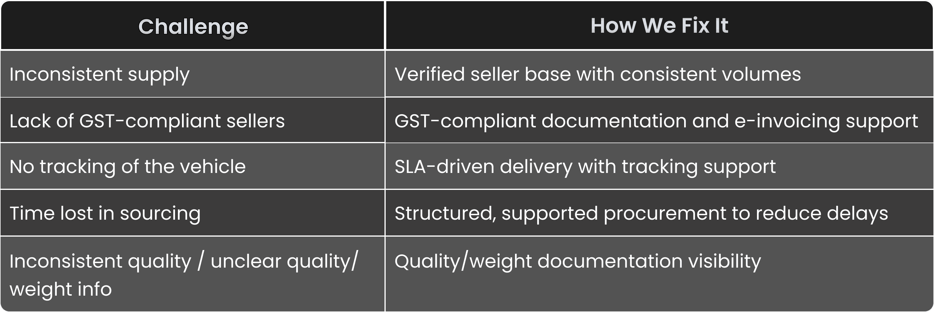 Inconsistent supply, lack of GST-compliant sellers, no vehicle tracking, time lost in sourcing, and inconsistent quality with unclear quality/weight information.