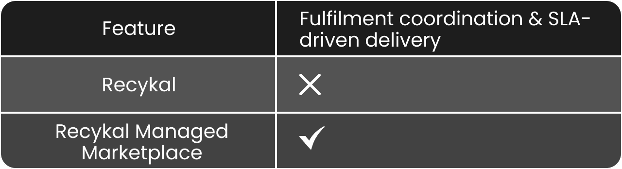 It is a managed marketplace offering GST-compliant sellers, SLA-based delivery, quality/weight documentation visibility, digital documentation, and risk-mitigated, structured sourcing.