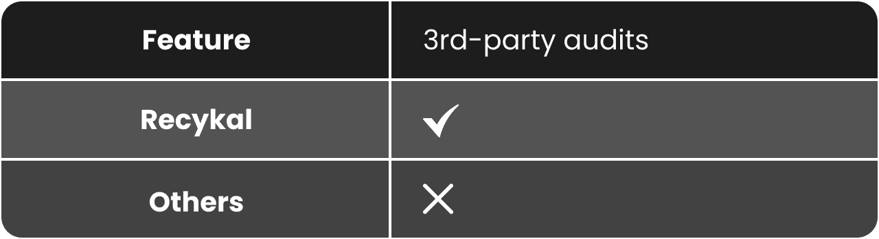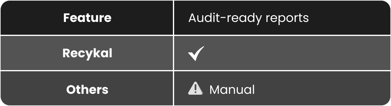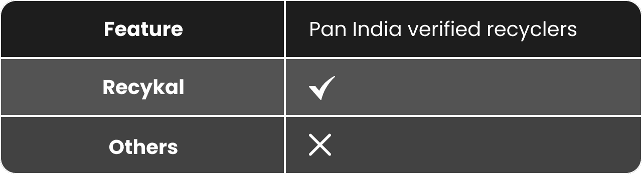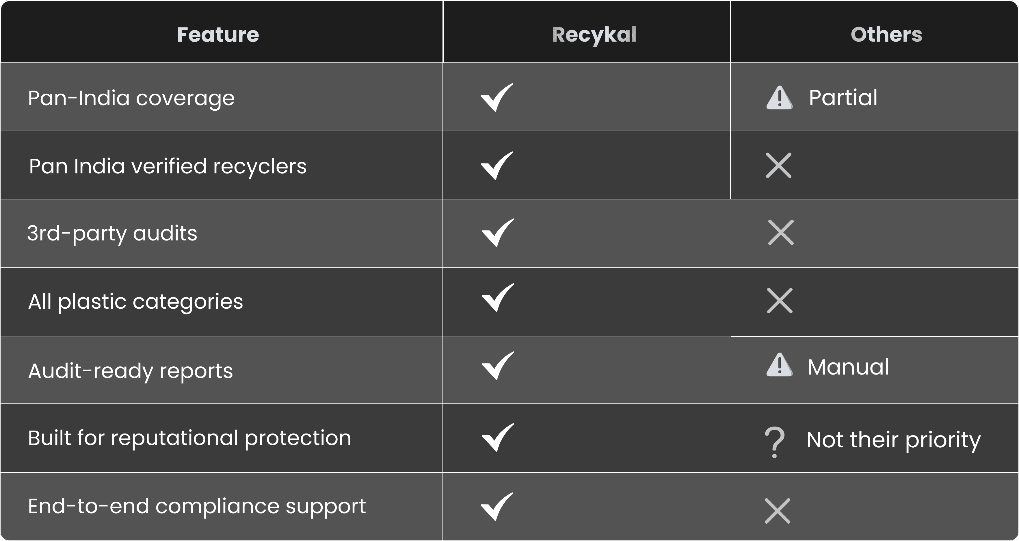 Recykal offers: 1) Verified recycler network across India 2) Real-time tracking of target fulfilment 3) Digital documentation for invoices, credits, and reports 4) 3rd-party audits and traceability 5) Automated alerts for filings and renewals All designed to keep your brand 100% compliant and audit-ready.