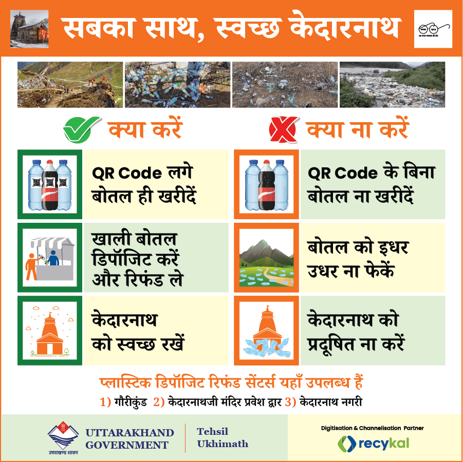 To tackle the increasing problem of plastic waste in Kedarnath, Tehsil Ukhimath had reached out to various agencies for innovative and disruptive solutions. Recykal proposed one of its kind Deposit Refund System Project to SDM, Ukhimath dt. 3rd May 2022 under the Plastic Waste Management Rules, 2016.