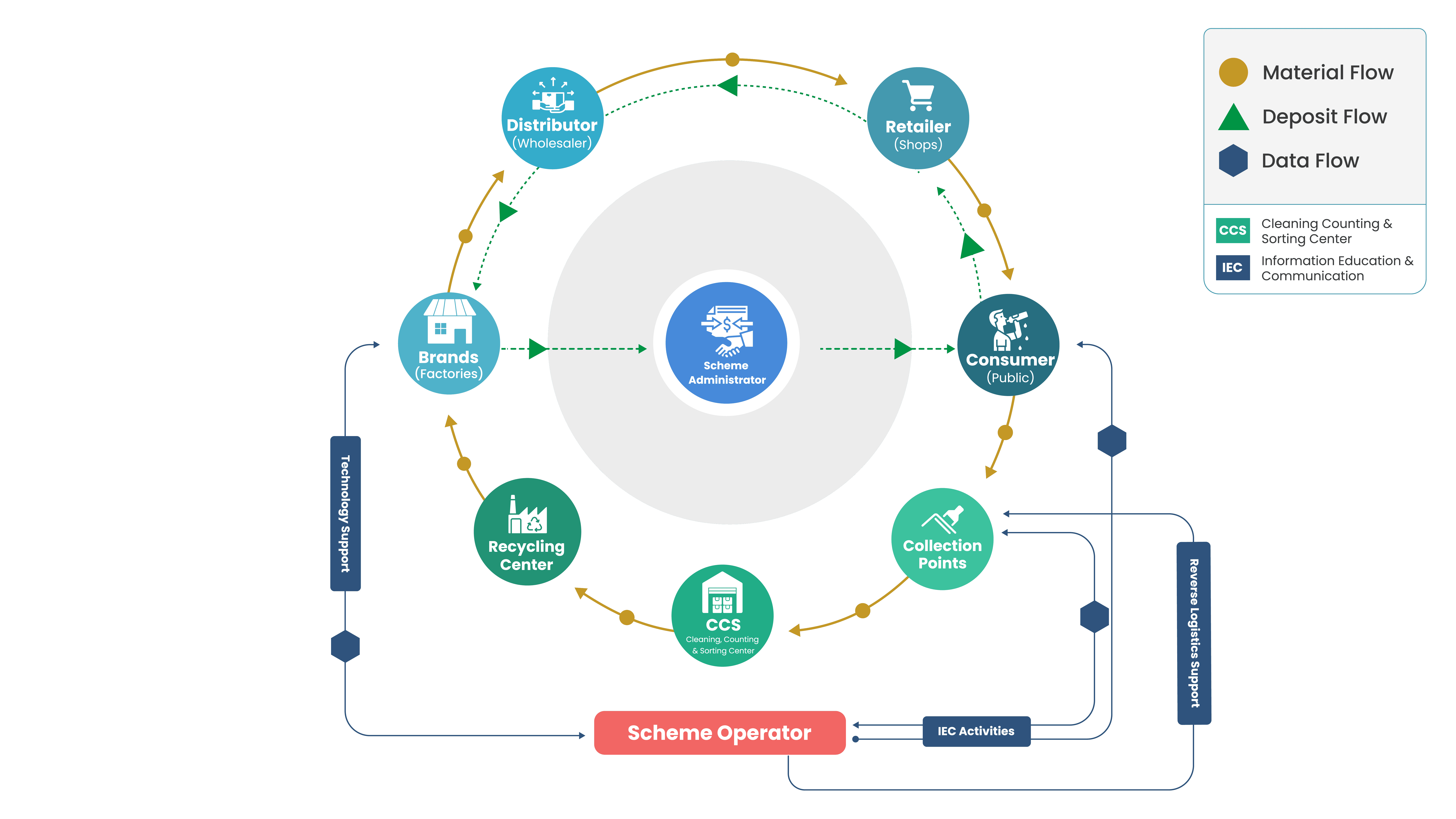 A Deposit Refund System connects producers, retailers, consumers, and recyclers through transparent flows of materials, deposits, and data, governed by a Central Scheme Administrator.